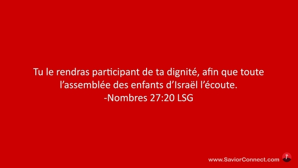 Tu le rendras participant de ta dignité, afin que toute l'assemblée des enfants d'Israël l'écoute. -Nombres 27:20 LSG