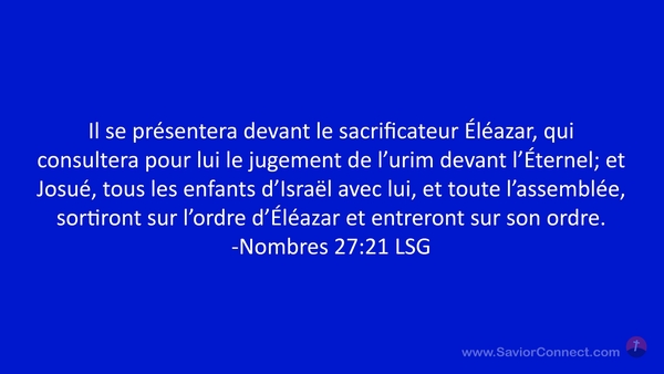 Il se présentera devant le sacrificateur Éléazar, qui consultera pour lui le jugement de l'urim devant l'Éternel; et Josué, tous les enfants d'Israël avec lui, et toute l'assemblée, sortiront sur l'ordre d'Éléazar et entreront sur son ordre. -Nombres 27:21 LSG