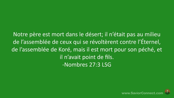 Notre père est mort dans le désert; il n'était pas au milieu de l'assemblée de ceux qui se révoltèrent contre l'Éternel, de l'assemblée de Koré, mais il est mort pour son péché, et il n'avait point de fils. -Nombres 27:3 LSG