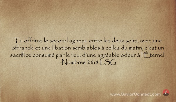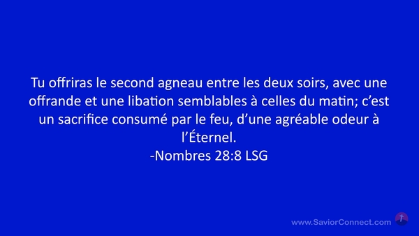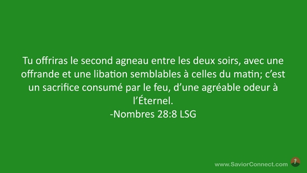 Tu offriras le second agneau entre les deux soirs, avec une offrande et une libation semblables à celles du matin; c'est un sacrifice consumé par le feu, d'une agréable odeur à l'Éternel. -Nombres 28:8 LSG