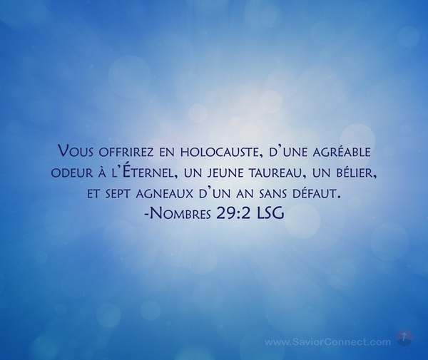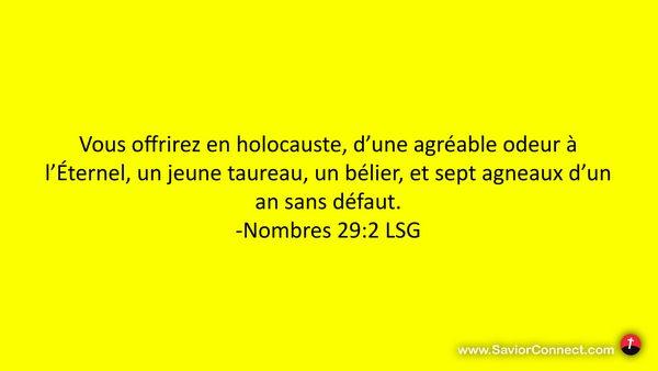 Vous offrirez en holocauste, d'une agréable odeur à l'Éternel, un jeune taureau, un bélier, et sept agneaux d'un an sans défaut. -Nombres 29:2 LSG