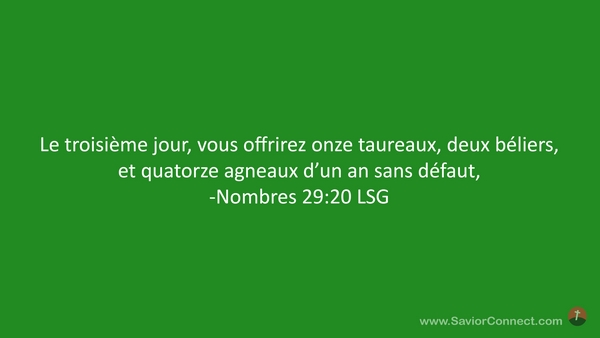 Le troisième jour, vous offrirez onze taureaux, deux béliers, et quatorze agneaux d'un an sans défaut, -Nombres 29:20 LSG
