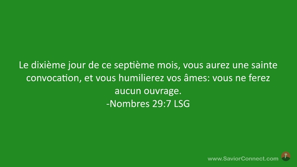 Le dixième jour de ce septième mois, vous aurez une sainte convocation, et vous humilierez vos âmes: vous ne ferez aucun ouvrage. -Nombres 29:7 LSG