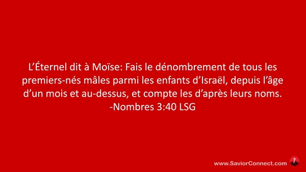 L'Éternel dit à Moïse: Fais le dénombrement de tous les premiers-nés mâles parmi les enfants d'Israël, depuis l'âge d'un mois et au-dessus, et compte les d'après leurs noms. -Nombres 3:40 LSG
