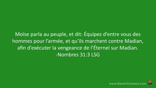 Moïse parla au peuple, et dit: Équipez d'entre vous des hommes pour l'armée, et qu'ils marchent contre Madian, afin d'exécuter la vengeance de l'Éternel sur Madian. -Nombres 31:3 LSG