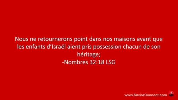 Nous ne retournerons point dans nos maisons avant que les enfants d'Israël aient pris possession chacun de son héritage; -Nombres 32:18 LSG