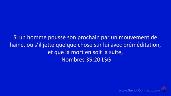 Si un homme pousse son prochain par un mouvement de haine, ou s'il jette quelque chose sur lui avec préméditation, et que la mort en soit la suite, -Nombres 35:20 LSG