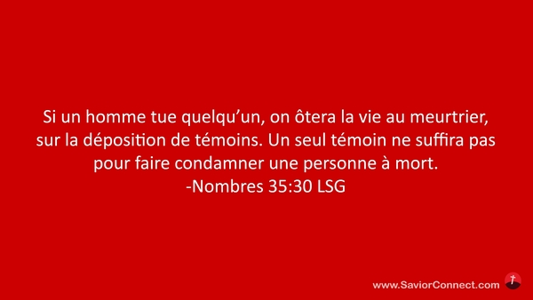 Si un homme tue quelqu'un, on ôtera la vie au meurtrier, sur la déposition de témoins. Un seul témoin ne suffira pas pour faire condamner une personne à mort. -Nombres 35:30 LSG