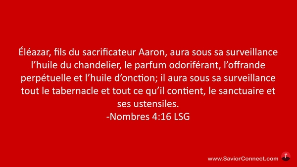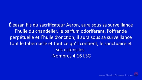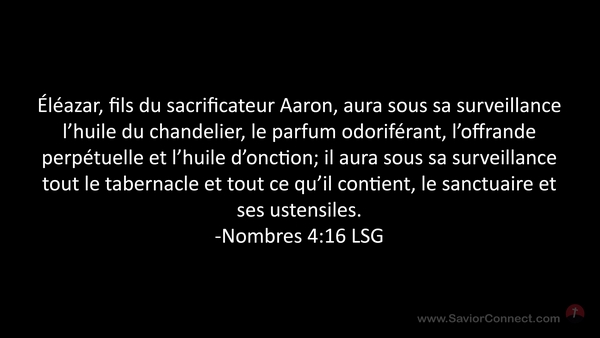 Éléazar, fils du sacrificateur Aaron, aura sous sa surveillance l'huile du chandelier, le parfum odoriférant, l'offrande perpétuelle et l'huile d'onction; il aura sous sa surveillance tout le tabernacle et tout ce qu'il contient, le sanctuaire et ses ustensiles. -Nombres 4:16 LSG