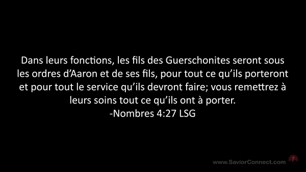 Dans leurs fonctions, les fils des Guerschonites seront sous les ordres d'Aaron et de ses fils, pour tout ce qu'ils porteront et pour tout le service qu'ils devront faire; vous remettrez à leurs soins tout ce qu'ils ont à porter. -Nombres 4:27 LSG
