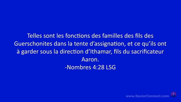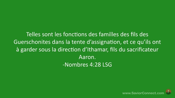 Telles sont les fonctions des familles des fils des Guerschonites dans la tente d'assignation, et ce qu'ils ont à garder sous la direction d'Ithamar, fils du sacrificateur Aaron. -Nombres 4:28 LSG