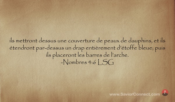 ils mettront dessus une couverture de peaux de dauphins, et ils étendront par-dessus un drap entièrement d'étoffe bleue; puis ils placeront les barres de l'arche. -Nombres 4:6 LSG