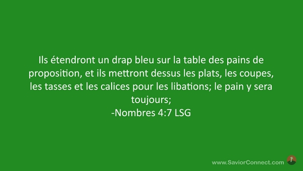 Ils étendront un drap bleu sur la table des pains de proposition, et ils mettront dessus les plats, les coupes, les tasses et les calices pour les libations; le pain y sera toujours; -Nombres 4:7 LSG