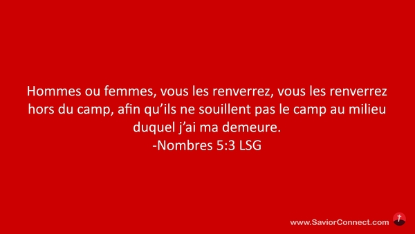 Hommes ou femmes, vous les renverrez, vous les renverrez hors du camp, afin qu'ils ne souillent pas le camp au milieu duquel j'ai ma demeure. -Nombres 5:3 LSG