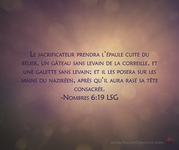 Le sacrificateur prendra l'épaule cuite du bélier, un gâteau sans levain de la corbeille, et une galette sans levain; et il les posera sur les mains du naziréen, après qu'il aura rasé sa tête consacrée. -Nombres 6:19 LSG