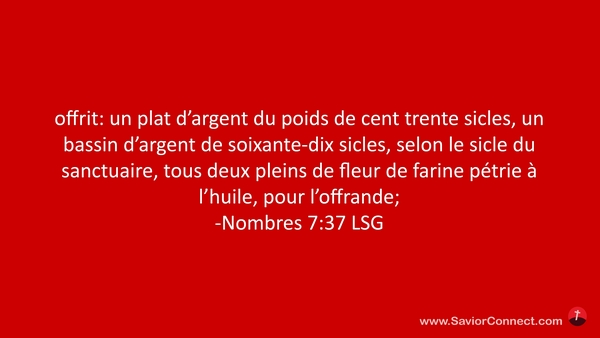 offrit: un plat d'argent du poids de cent trente sicles, un bassin d'argent de soixante-dix sicles, selon le sicle du sanctuaire, tous deux pleins de fleur de farine pétrie à l'huile, pour l'offrande; -Nombres 7:37 LSG