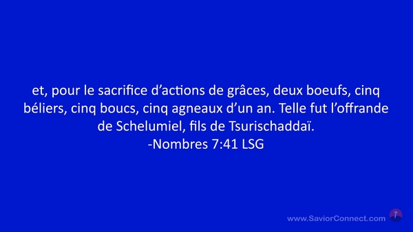 et, pour le sacrifice d'actions de grâces, deux boeufs, cinq béliers, cinq boucs, cinq agneaux d'un an. Telle fut l'offrande de Schelumiel, fils de Tsurischaddaï. -Nombres 7:41 LSG