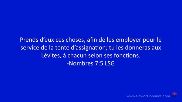 Prends d'eux ces choses, afin de les employer pour le service de la tente d'assignation; tu les donneras aux Lévites, à chacun selon ses fonctions. -Nombres 7:5 LSG