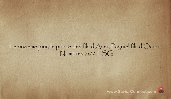 Le onzième jour, le prince des fils d'Aser, Paguiel fils d'Ocran, -Nombres 7:72 LSG
