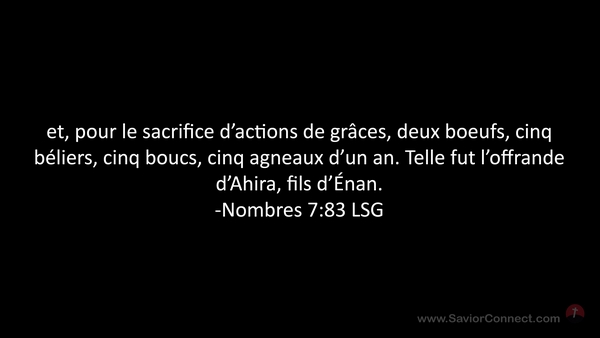 et, pour le sacrifice d'actions de grâces, deux boeufs, cinq béliers, cinq boucs, cinq agneaux d'un an. Telle fut l'offrande d'Ahira, fils d'Énan. -Nombres 7:83 LSG