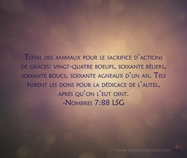 Total des animaux pour le sacrifice d'actions de grâces: vingt-quatre boeufs, soixante béliers, soixante boucs, soixante agneaux d'un an. Tels furent les dons pour la dédicace de l'autel, après qu'on l'eut oint. -Nombres 7:88 LSG