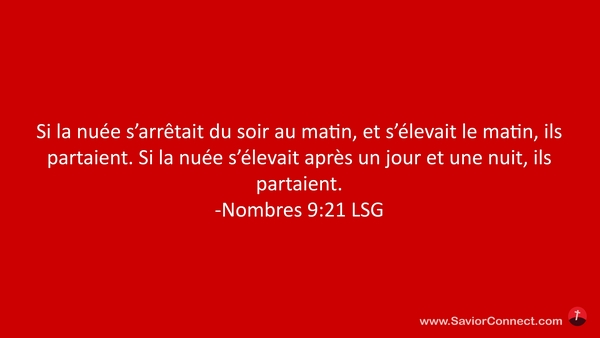 Si la nuée s'arrêtait du soir au matin, et s'élevait le matin, ils partaient. Si la nuée s'élevait après un jour et une nuit, ils partaient. -Nombres 9:21 LSG