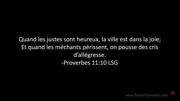Quand les justes sont heureux, la ville est dans la joie; Et quand les méchants périssent, on pousse des cris d'allégresse. -Proverbes 11:10 LSG