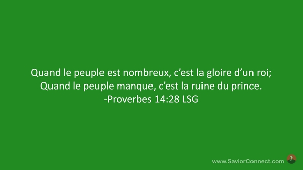 Quand le peuple est nombreux, c'est la gloire d'un roi; Quand le peuple manque, c'est la ruine du prince. -Proverbes 14:28 LSG