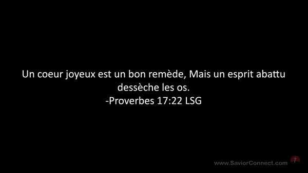 Un coeur joyeux est un bon remède, Mais un esprit abattu dessèche les os. -Proverbes 17:22 LSG