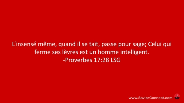 L'insensé même, quand il se tait, passe pour sage; Celui qui ferme ses lèvres est un homme intelligent. -Proverbes 17:28 LSG