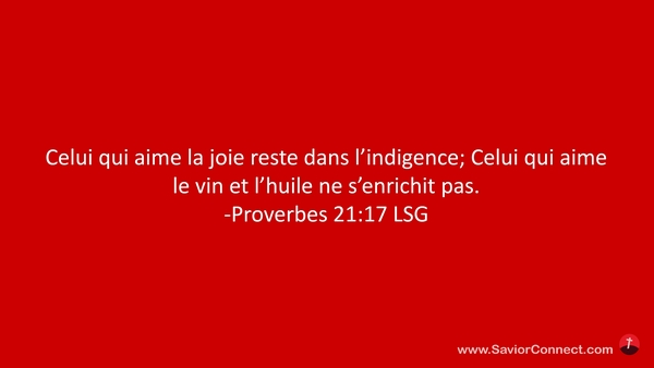 Celui qui aime la joie reste dans l'indigence; Celui qui aime le vin et l'huile ne s'enrichit pas. -Proverbes 21:17 LSG