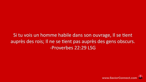 Si tu vois un homme habile dans son ouvrage, Il se tient auprès des rois; Il ne se tient pas auprès des gens obscurs. -Proverbes 22:29 LSG