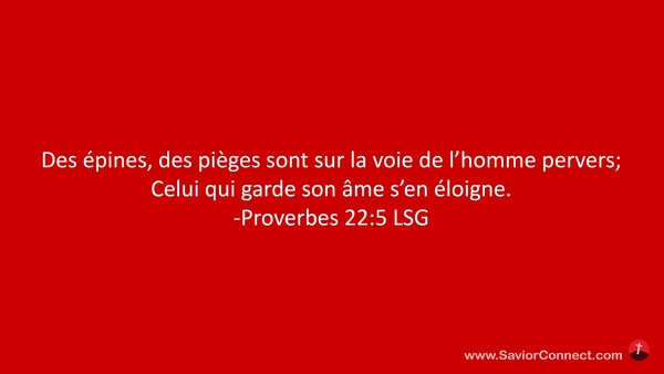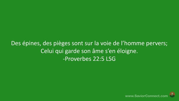 Des épines, des pièges sont sur la voie de l'homme pervers; Celui qui garde son âme s'en éloigne. -Proverbes 22:5 LSG