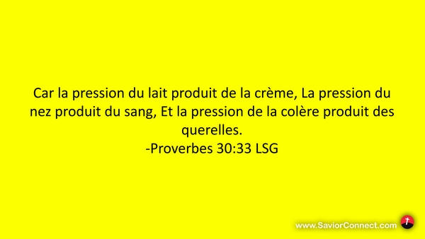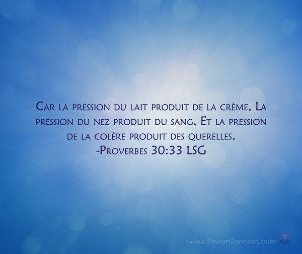 Car la pression du lait produit de la crème, La pression du nez produit du sang, Et la pression de la colère produit des querelles. -Proverbes 30:33 LSG