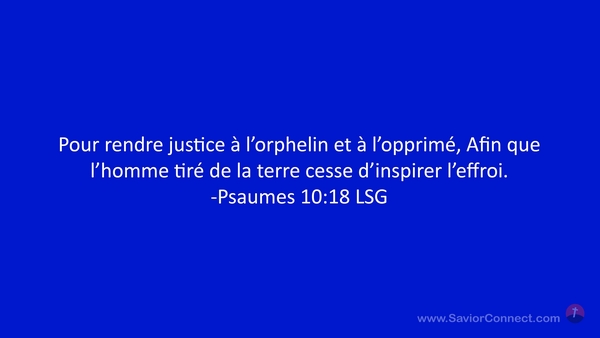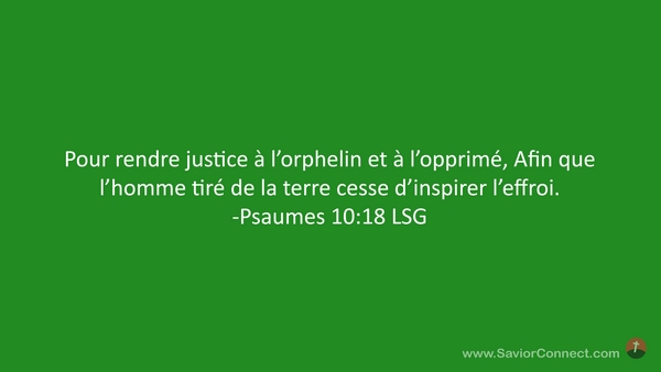 Pour rendre justice à l'orphelin et à l'opprimé, Afin que l'homme tiré de la terre cesse d'inspirer l'effroi. -Psaumes 10:18 LSG