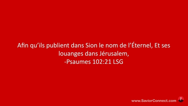 Afin qu'ils publient dans Sion le nom de l'Éternel, Et ses louanges dans Jérusalem, -Psaumes 102:21 LSG