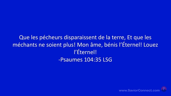 Que les pécheurs disparaissent de la terre, Et que les méchants ne soient plus! Mon âme, bénis l'Éternel! Louez l'Éternel! -Psaumes 104:35 LSG