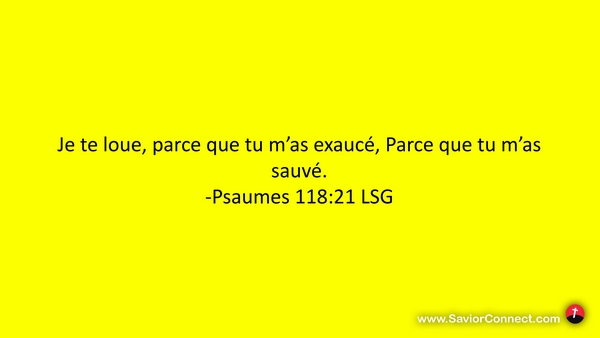 Je te loue, parce que tu m'as exaucé, Parce que tu m'as sauvé. -Psaumes 118:21 LSG