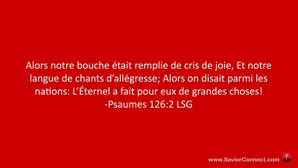 Alors notre bouche était remplie de cris de joie, Et notre langue de chants d'allégresse; Alors on disait parmi les nations: L'Éternel a fait pour eux de grandes choses! -Psaumes 126:2 LSG