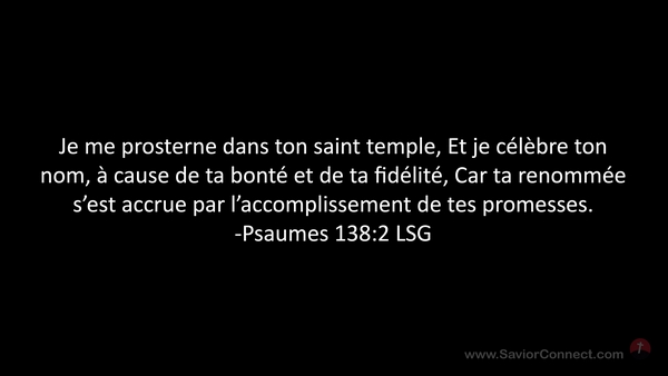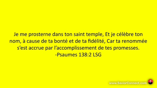 Je me prosterne dans ton saint temple, Et je célèbre ton nom, à cause de ta bonté et de ta fidélité, Car ta renommée s'est accrue par l'accomplissement de tes promesses. -Psaumes 138:2 LSG