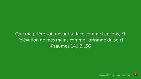 Que ma prière soit devant ta face comme l'encens, Et l'élévation de mes mains comme l'offrande du soir! -Psaumes 141:2 LSG