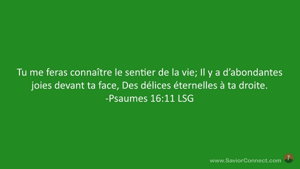 Tu me feras connaître le sentier de la vie; Il y a d'abondantes joies devant ta face, Des délices éternelles à ta droite. -Psaumes 16:11 LSG