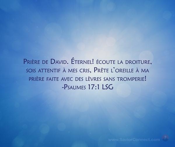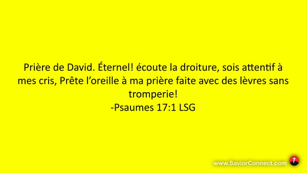 Prière de David. Éternel! écoute la droiture, sois attentif à mes cris, Prête l'oreille à ma prière faite avec des lèvres sans tromperie! -Psaumes 17:1 LSG
