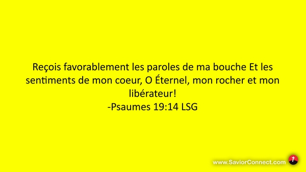 Reçois favorablement les paroles de ma bouche Et les sentiments de mon coeur, O Éternel, mon rocher et mon libérateur! -Psaumes 19:14 LSG