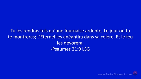 Tu les rendras tels qu'une fournaise ardente, Le jour où tu te montreras; L'Éternel les anéantira dans sa colère, Et le feu les dévorera. -Psaumes 21:9 LSG