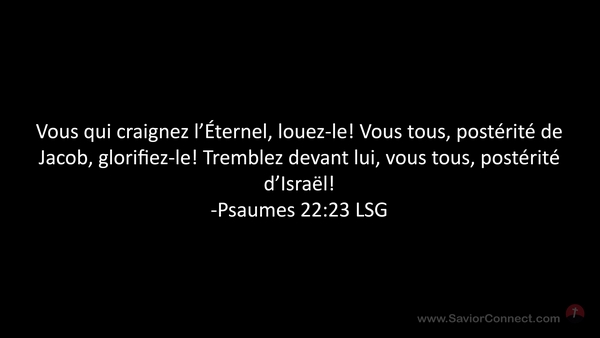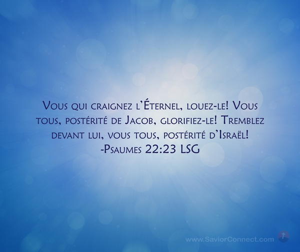 Vous qui craignez l'Éternel, louez-le! Vous tous, postérité de Jacob, glorifiez-le! Tremblez devant lui, vous tous, postérité d'Israël! -Psaumes 22:23 LSG