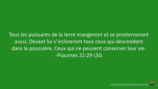 Tous les puissants de la terre mangeront et se prosterneront aussi; Devant lui s'inclineront tous ceux qui descendent dans la poussière, Ceux qui ne peuvent conserver leur vie. -Psaumes 22:29 LSG
