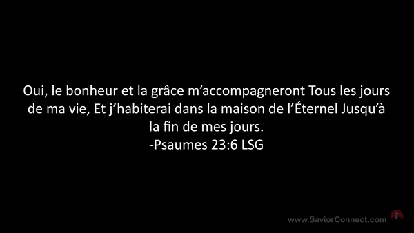 Oui, le bonheur et la grâce m'accompagneront Tous les jours de ma vie, Et j'habiterai dans la maison de l'Éternel Jusqu'à la fin de mes jours. -Psaumes 23:6 LSG