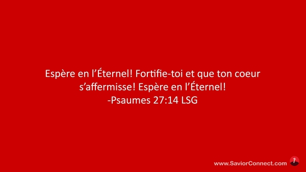 Espère en l'Éternel! Fortifie-toi et que ton coeur s'affermisse! Espère en l'Éternel! -Psaumes 27:14 LSG