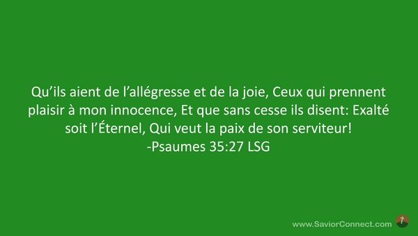 Qu'ils aient de l'allégresse et de la joie, Ceux qui prennent plaisir à mon innocence, Et que sans cesse ils disent: Exalté soit l'Éternel, Qui veut la paix de son serviteur! -Psaumes 35:27 LSG